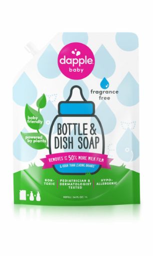 Baby friendly Powered by plants REMOVES UP TO 50% MORE MILK FILM & ODOR THAN LEADING BRANDS* Pediatrician & dermatologist tested Hypoallergenic Our plant-based Bottle & Dish Soap is so effective it removes up to 50% more milk film & odor than other leading brands* *visit dapplebaby.com for information FOR SUPER CLEAN EVERYTHING: bottles sippy cups utensils pacifiers breast pump components whole family's dishes Not Tested on Animals