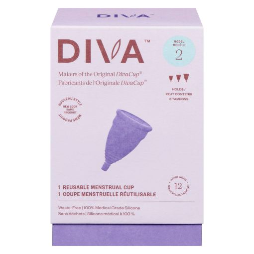 Diva™ Makers of the Original DivaCup® Holds 6 tampons New look same product Waste-Free 100% Medical Grade Silicone 12 hour wear Conscious Period Care For Every Body Trusted since 2003, the DivaCup® is a reusable tampon alternative designed to collect your flow rather than absorb it. Consciously designed for comfort and 12 hours of continuous period protection. Purposefully created for a waste-free, sustainable period experience. - Confident leak protection - Chemical-free - Free of latex, BPAs, phthalates, plastic, and rubber Easy insertion & removal Reusable & sustainable Comfortable all-day wear Safe & natural Find your size: MODEL 0 - For light flow days; holds 4 tampons - Best for teens or first-time users - Fit for slim or narrow vaginal canals MODEL 1 - For medium to heavy flow days; holds 5 tampons - Best for ages 18+ - Most popular size cup MODEL 2 - For medium to super-heavy flow days; holds 6 tampons - Best for ages 35+ or those with wider vaginal canals - Fit for post-partum bodies SOFT 100% MEDICAL GRADE SILICONE that becomes more flexible with body heat LEAK-RESISTANT AIR HOLES create a seal to secure the cup in place VISIBLE FLOW LINES to keep track of your period EASY TO GRIP for hassle-free removal Founded by women