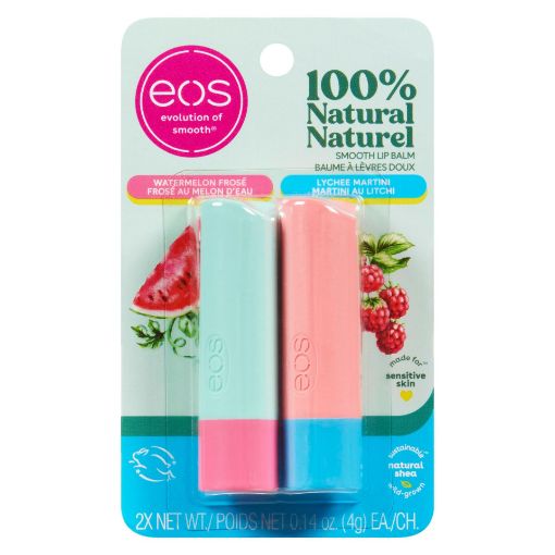 eos Evolution of smooth® Made for™ Sensitive skin Natural shea Sustainable™ wild-grown 100% Natural + All-Day Moisture Our dermatologist-recommended lip balm is formulated for sensitive skin and made with soothing shea butter, weightless coconut oil and protective antioxidants. Watermelon frosé tastes like pink sparkling frosé, all day. Lychee martini tastes like a never-ending happy hour. Dermatologist-Recommended sensitive skin