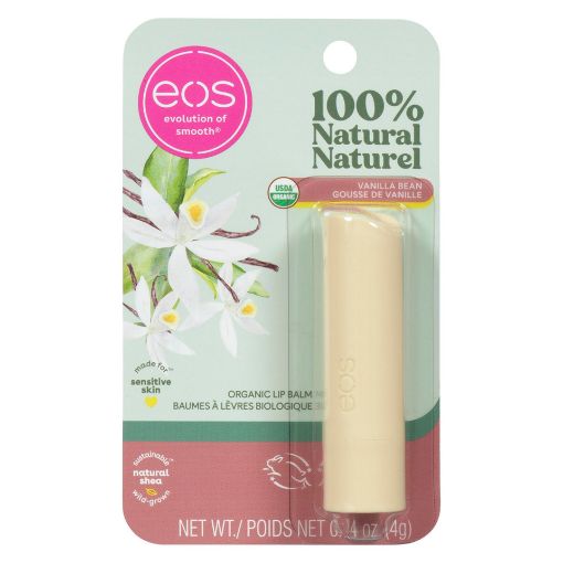 eos Evolution of smooth® Made for™ Sensitive skin Natural shea Sustainable™ wild-grown 100% Natural + All-Day Moisture Our USDA Certified Organic, dermatologist-recommended lip balm is formulated for sensitive skin and made with soothing shea butter, weightless coconut oil and protective antioxidants. Vanilla bean tastes like smooth, rich and creamy vanilla. Dermatologist-Recommended sensitive skin Certified Organic by Oregon Tilth