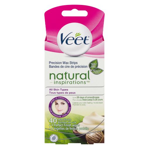Naturally derived Shea butter Up to 28 days of smoothness Leaves your skin feeling moisturized Dermatologically tested Experience the touch of nature with Veet Natural Inspirations™ Face Precision Wax Strips. Confidence to achieve great 1st time results, even for those inexperienced with wax strips. Veet Face Precision Wax Strips Natural Inspirations™ give you long-lasting smoothness for up to 28 days. Our formula leaves the skin feeling moisturized and touchably soft. They're ideal for small and delicate areas like your upper lip, cheeks and chin. The strips are optimized to allow more precise application in these small areas. Dermatologically tested. Visit veet.ca for more tips and information. rb Health-hygiene-home
