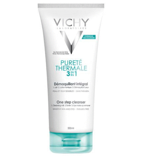 One Step Cleanser Sensitive Skin 1.Cleansing milk 2.Toner 3.Eye make-up remover In only one step, perfectly cleanses make-up on face and eyes and tonifies. Cleansed of impurities and pollution particles, skin is soft, fresh and comfortable. With Vichy Thermal Spa Water. Tested under dermatological and ophthalmological control. Allergy tested. Suitable for sensitive eyes and contact lens wearers. Apply using a cotton pad. No rinsing required. No greasy finish.