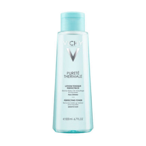 Removes make-up residue and impurities Sensitive skin Follow cleansing with the perfecting toner to remove make up residue and impurities. Skin looks clear and fresh. With Vichy Thermal Spa Water. Tested on sensitive skin under dermatological control. Allergy tested. No alcohol. Apply using a cotton pad. No rinsing required.
